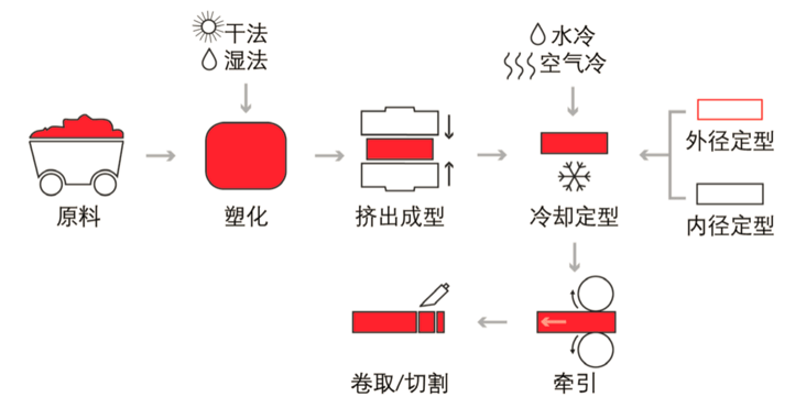 借助螺桿或柱塞的擠壓作用,使受熱熔融的高分子材料在壓力的推動下,強行通過機頭模具而成型為具有恒定截面連續型材。目前我國擠出成型制品占塑料制品總量的1/3以上。