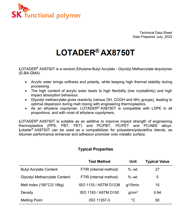 - EMA 法國阿科瑪 AX8750 塑料改性劑 粘結樹脂 PC加纖料改性兼容劑 物性表, EMA 法國阿科瑪 AX8750 塑料改性劑 粘結樹脂 PC加纖料改性兼容劑 產品參數,EMA 法國阿科瑪 AX8750 塑料改性劑 粘結樹脂 PC加纖料改性兼容劑 性能表,EMA 法國阿科瑪 AX8750 塑料改性劑 粘結樹脂 PC加纖料改性兼容劑 出廠報告, MSDS,, 物質安全資料表, UL黃卡,{ SGS報告, RoHS, 食品級認證, NSF飲用水標準, 產品資料, 產品性能, 出廠報告, 原廠原包, 代理商, 熱變形溫度, 熔指數, 流動系數, 抗沖擊性能、沖擊強度, 低溫韌性、低溫抗沖擊性能, 熔體流動系數、熔體流動速率, 加工工藝、加工參數、加工溫度, 歐盟RoHS 德國FDA 美國FDA 日本FDA