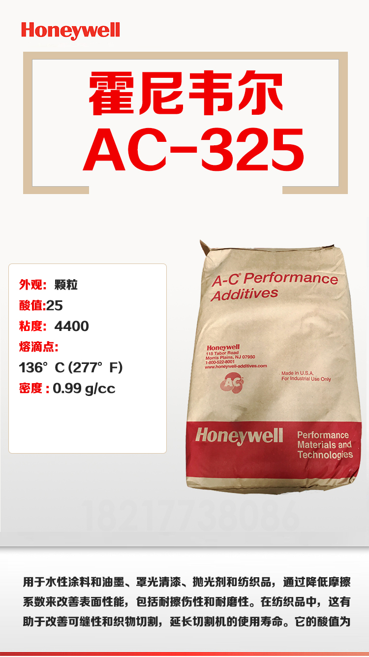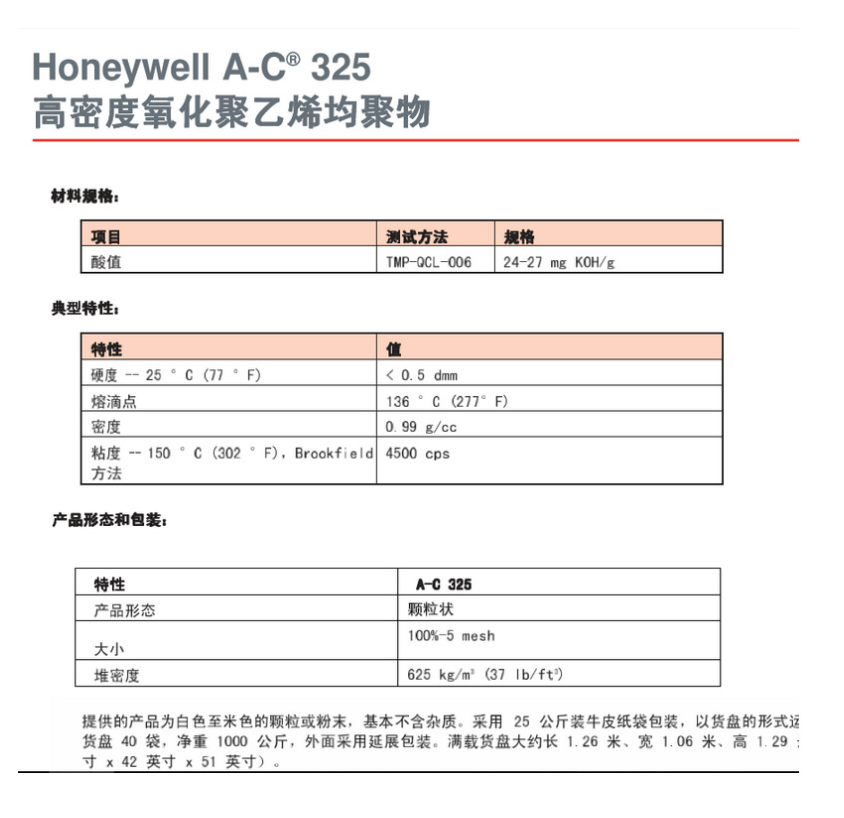 - Honeywell霍尼韋爾氧化聚乙烯蠟 A-C 325 蠟粉 酸值高易乳化 物性表, Honeywell霍尼韋爾氧化聚乙烯蠟 A-C 325 蠟粉 酸值高易乳化 產品參數,Honeywell霍尼韋爾氧化聚乙烯蠟 A-C 325 蠟粉 酸值高易乳化 性能表,Honeywell霍尼韋爾氧化聚乙烯蠟 A-C 325 蠟粉 酸值高易乳化 出廠報告, MSDS,, 物質安全資料表, UL黃卡,{ SGS報告, RoHS, 食品級認證, NSF飲用水標準, 產品資料, 產品性能, 出廠報告, 原廠原包, 代理商, 熱變形溫度, 熔指數, 流動系數, 抗沖擊性能、沖擊強度, 低溫韌性、低溫抗沖擊性能, 熔體流動系數、熔體流動速率, 加工工藝、加工參數、加工溫度, 歐盟RoHS 德國FDA 美國FDA 日本FDA