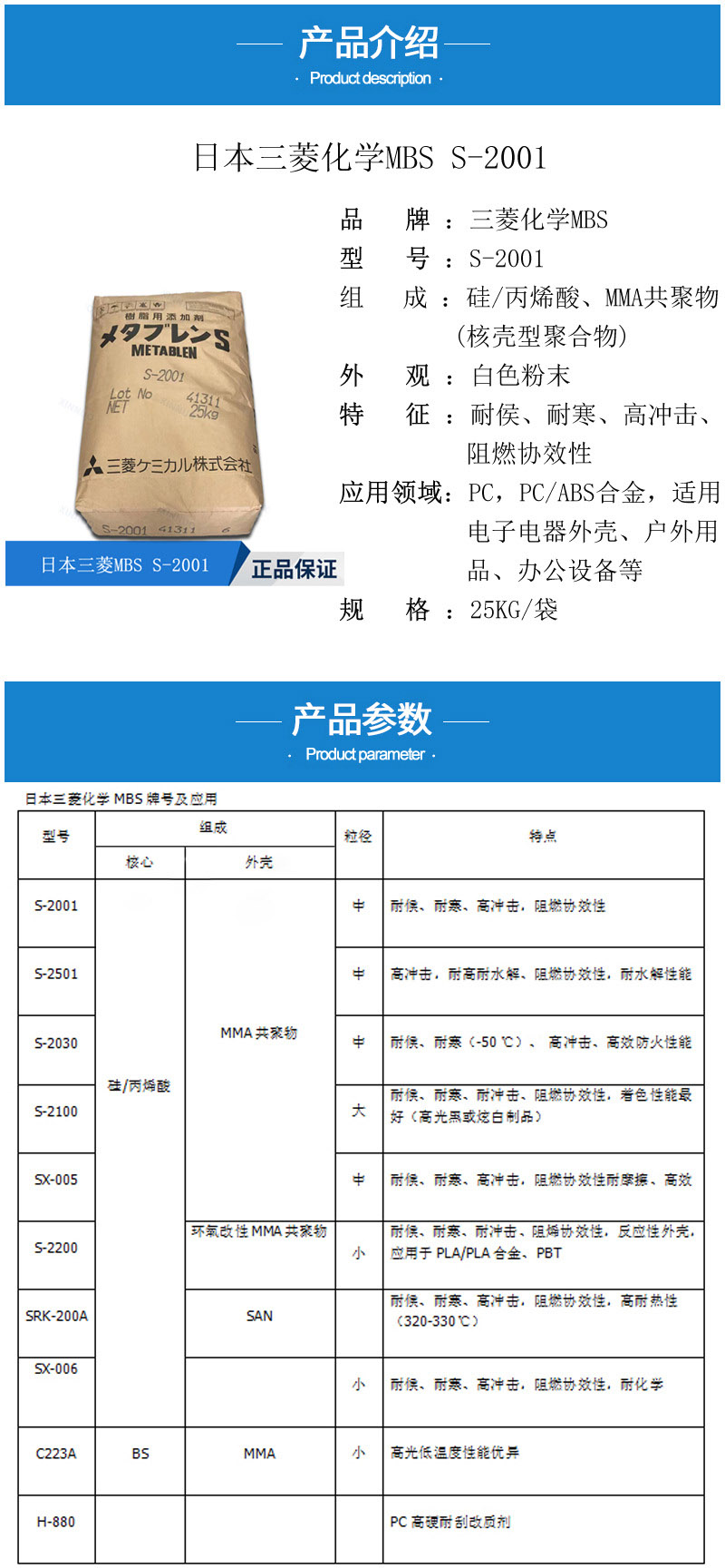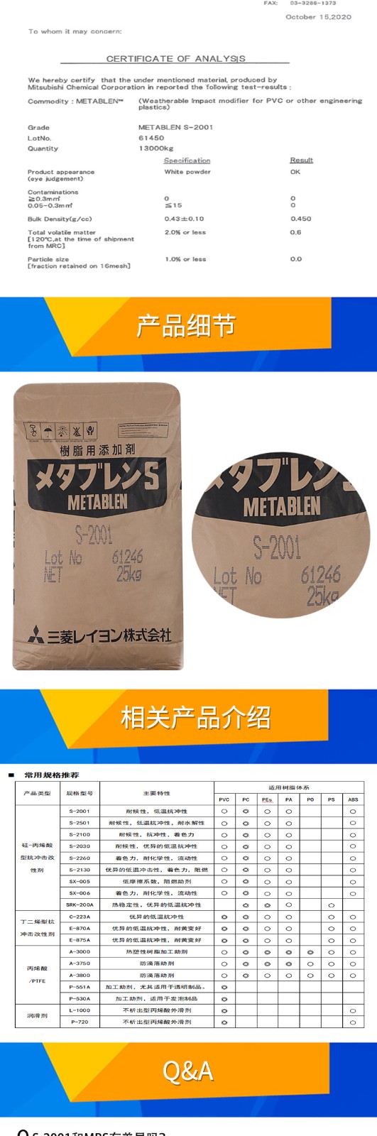 - 日本三菱S2001增韌劑 塑料改性 PC增韌耐候耐寒 麗陽MBS S-2001 物性表, 日本三菱S2001增韌劑 塑料改性 PC增韌耐候耐寒 麗陽MBS S-2001 產品參數,日本三菱S2001增韌劑 塑料改性 PC增韌耐候耐寒 麗陽MBS S-2001 性能表,日本三菱S2001增韌劑 塑料改性 PC增韌耐候耐寒 麗陽MBS S-2001 出廠報告, MSDS,, 物質安全資料表, UL黃卡,{ SGS報告, RoHS, 食品級認證, NSF飲用水標準, 產品資料, 產品性能, 出廠報告, 原廠原包, 代理商, 熱變形溫度, 熔指數, 流動系數, 抗沖擊性能、沖擊強度, 低溫韌性、低溫抗沖擊性能, 熔體流動系數、熔體流動速率, 加工工藝、加工參數、加工溫度, 歐盟RoHS 德國FDA 美國FDA 日本FDA