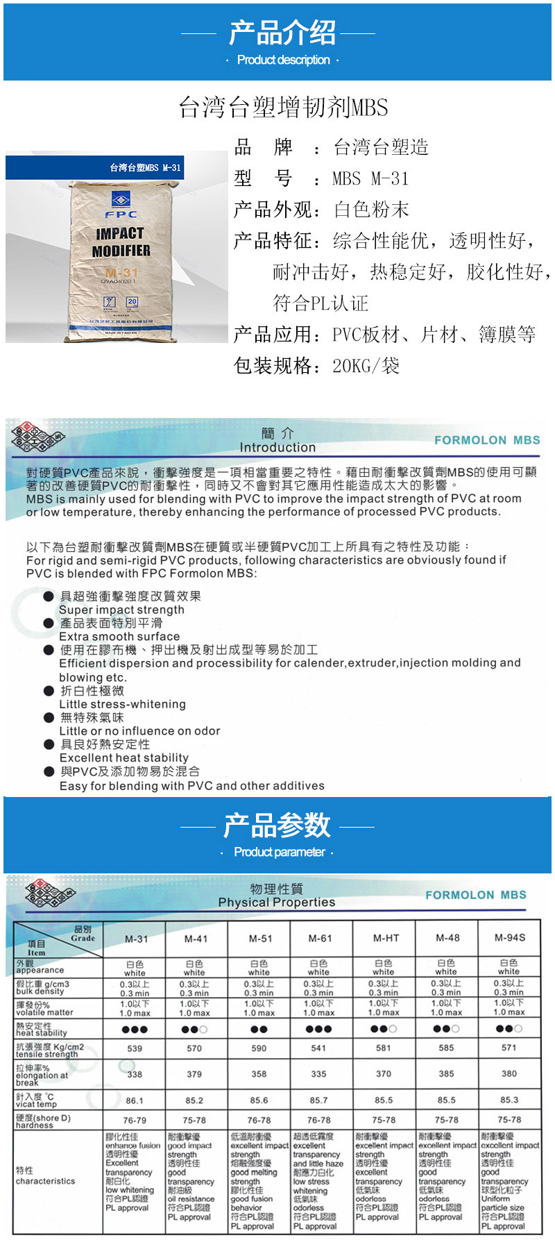 • 臺塑MBS M31綜合性能好 透明耐白化 PVC簿膜 板材片材 增韌劑M-31 物性表, 臺塑MBS M31綜合性能好 透明耐白化 PVC簿膜 板材片材 增韌劑M-31 產品參數,臺塑MBS M31綜合性能好 透明耐白化 PVC簿膜 板材片材 增韌劑M-31 性能表,臺塑MBS M31綜合性能好 透明耐白化 PVC簿膜 板材片材 增韌劑M-31 出廠報告, MSDS,, 物質安全資料表, UL黃卡,{ SGS報告, RoHS, 食品級認證, NSF飲用水標準, 產品資料, 產品性能, 出廠報告, 原廠原包, 代理商, 熱變形溫度, 熔指數, 流動系數, 抗沖擊性能、沖擊強度, 低溫韌性、低溫抗沖擊性能, 熔體流動系數、熔體流動速率, 加工工藝、加工參數、加工溫度, 歐盟RoHS 德國FDA 美國FDA 日本FDA
