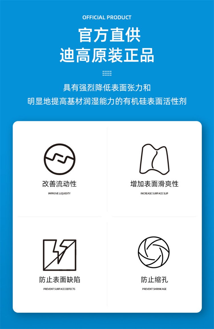 迪高TEGO Glide 410流平劑極佳的滑爽性和防縮孔效果。是一種高效產品,可用于多種涂料和油墨。