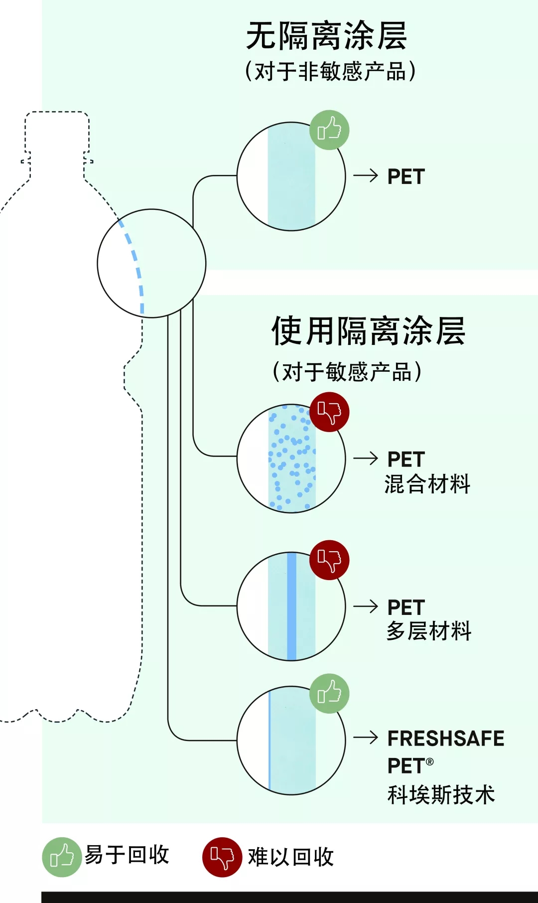 ????????沒有隔離涂層的PET瓶(用于非敏感產品)在回收過程中能產生100%的純 PET 材料。而針對保護敏感產品添加隔離涂層保護的PET瓶在回收過程中其涂層很難與PET瓶分離——FreshSafe PET? 確可以做到。利用FreshSafe PET?技術,保護層會在回收過程中被沖洗掉。