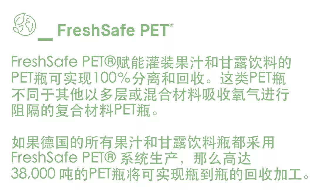 ????????新德國包裝法對果汁和花蜜瓶的解決方案:KHS科埃斯FreshSafe PET?技術將產品保護與瓶到瓶的可回收性結合在一起。