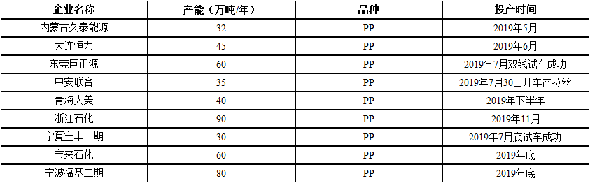 ????????1、2019年國內PP裝置投產情況
