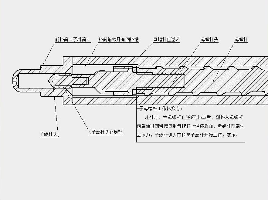 ????????注塑機根據產品的大小加足相應的原料,加料結束后,開始注射,螺桿向前運動,母螺桿頭上的母止逆環及子螺桿頭上的子止逆環滑向后端并閉合母螺桿頭上的進料通道,塑料在螺桿的推動下從前料筒的噴嘴射入模具,此時模腔注射壓力不用太高,當塑料快沖人模腔注射壓力會慢慢升高,注射到最后階段時,子螺桿頭進入前料筒同時母止逆環后端移動到回流槽的通道口(A點是母螺桿與子螺桿工作的轉換點),塑料從回流槽繞過母螺桿止逆環到其后端,母螺桿頭的前端失去壓力,此時子螺桿頭在前料筒中起作用,因子螺桿頭的端部面積可以做得比母螺桿頭的端部面積小很多(根據實際需要端部面積可以做到小達幾倍,相應的產生的壓力也可以是母螺桿頭產生的壓力的幾倍,一般模腔壓為250~300cm2/kg),所以模腔壓力是高壓,也可以是超高壓每平方厘米在一千公斤以上,可以滿足任何塑料產品的要求(用昂貴的氣體輔助注射設備最高也只能到每平方厘米700公斤),靈活調節注塑機電腦控制最后一段注射和一級二級保壓壓力,加工出來的塑料產品可以做到無縮印,高品質,高密度,高強度。