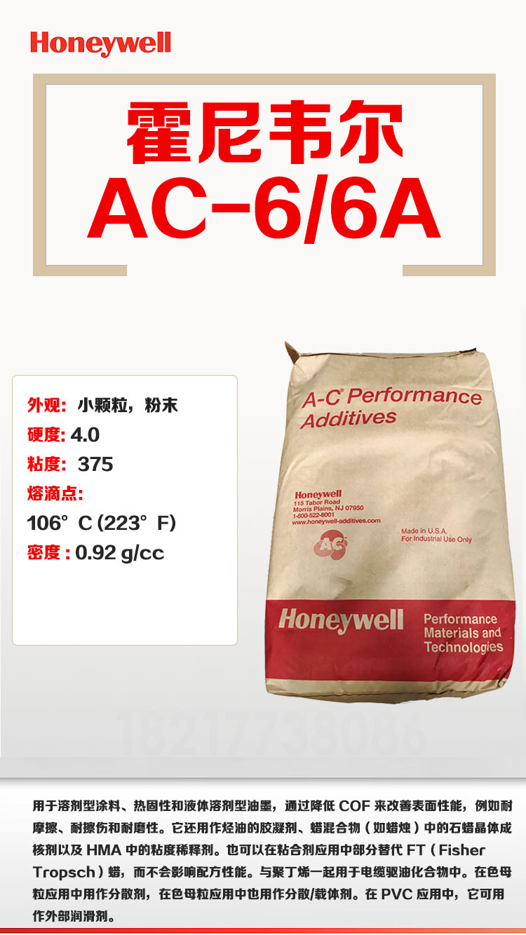 - 美國霍尼韋爾 HONEYWELL AC-6A 低分子聚乙烯蠟 物性表, 美國霍尼韋爾 HONEYWELL AC-6A 低分子聚乙烯蠟 產品參數,美國霍尼韋爾 HONEYWELL AC-6A 低分子聚乙烯蠟 性能表,美國霍尼韋爾 HONEYWELL AC-6A 低分子聚乙烯蠟 出廠報告, MSDS,, 物質安全資料表, UL黃卡,{ SGS報告, RoHS, 食品級認證, NSF飲用水標準, 產品資料, 產品性能, 出廠報告, 原廠原包, 代理商, 熱變形溫度, 熔指數, 流動系數, 抗沖擊性能、沖擊強度, 低溫韌性、低溫抗沖擊性能, 熔體流動系數、熔體流動速率, 加工工藝、加工參數、加工溫度, 歐盟RoHS 德國FDA 美國FDA 日本FDA
