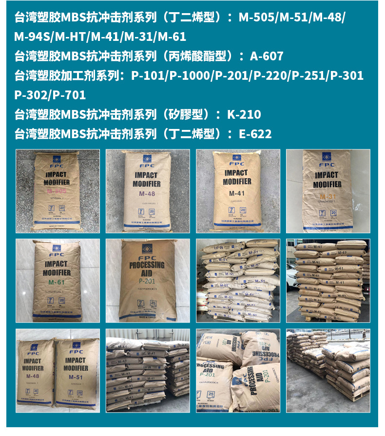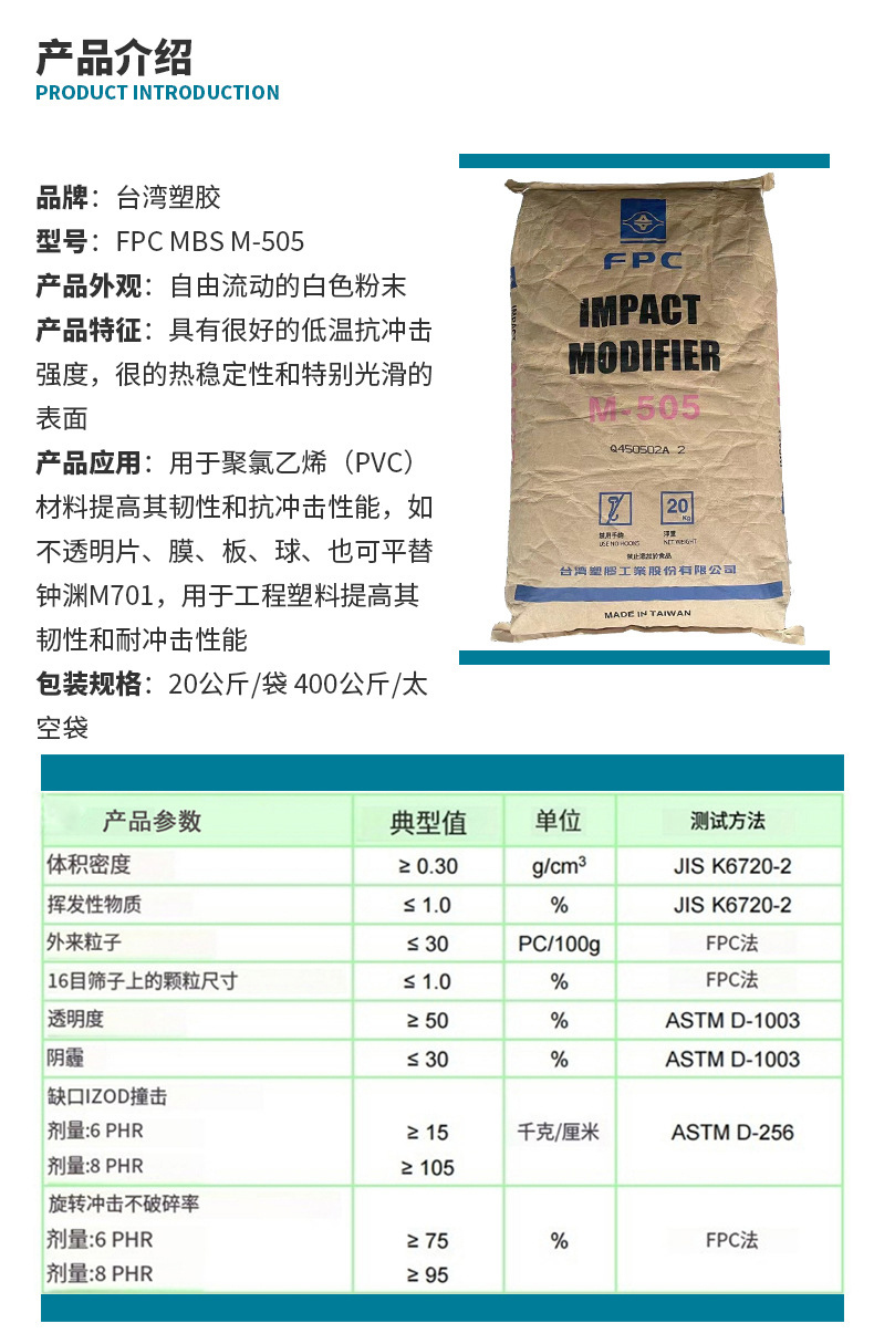 臺灣塑膠工業股分有限公司MBS M-505牌號簡介及應用臺塑M-505增韌耐沖擊改質劑,是用于硬質和半硬質PVC制品,如果PVC與M-505混合,具有以下特性:(1)優異的抗沖擊強度(低溫);(2)優異的熱穩定性;(3)特別光滑的表面。(4)應用/用途:不透明片、膜、板、球、工程塑料等。(5)物理特性:化學性質:甲基丙烯酸甲酯/丁二烯/苯乙烯物理性狀:自由流動的白色粉末對硬質PVC產品來說,沖擊強度是一項相當重要之特性。由耐沖擊...